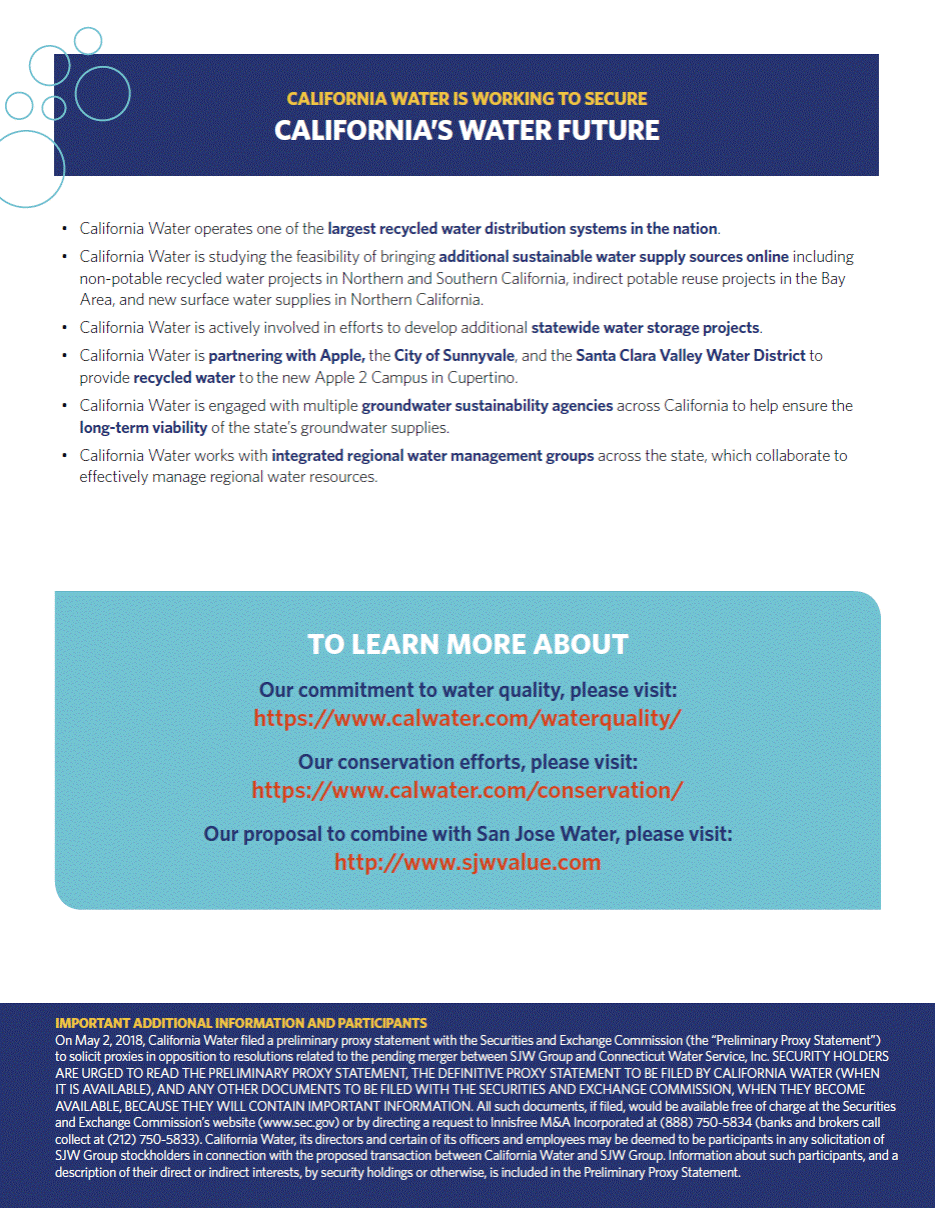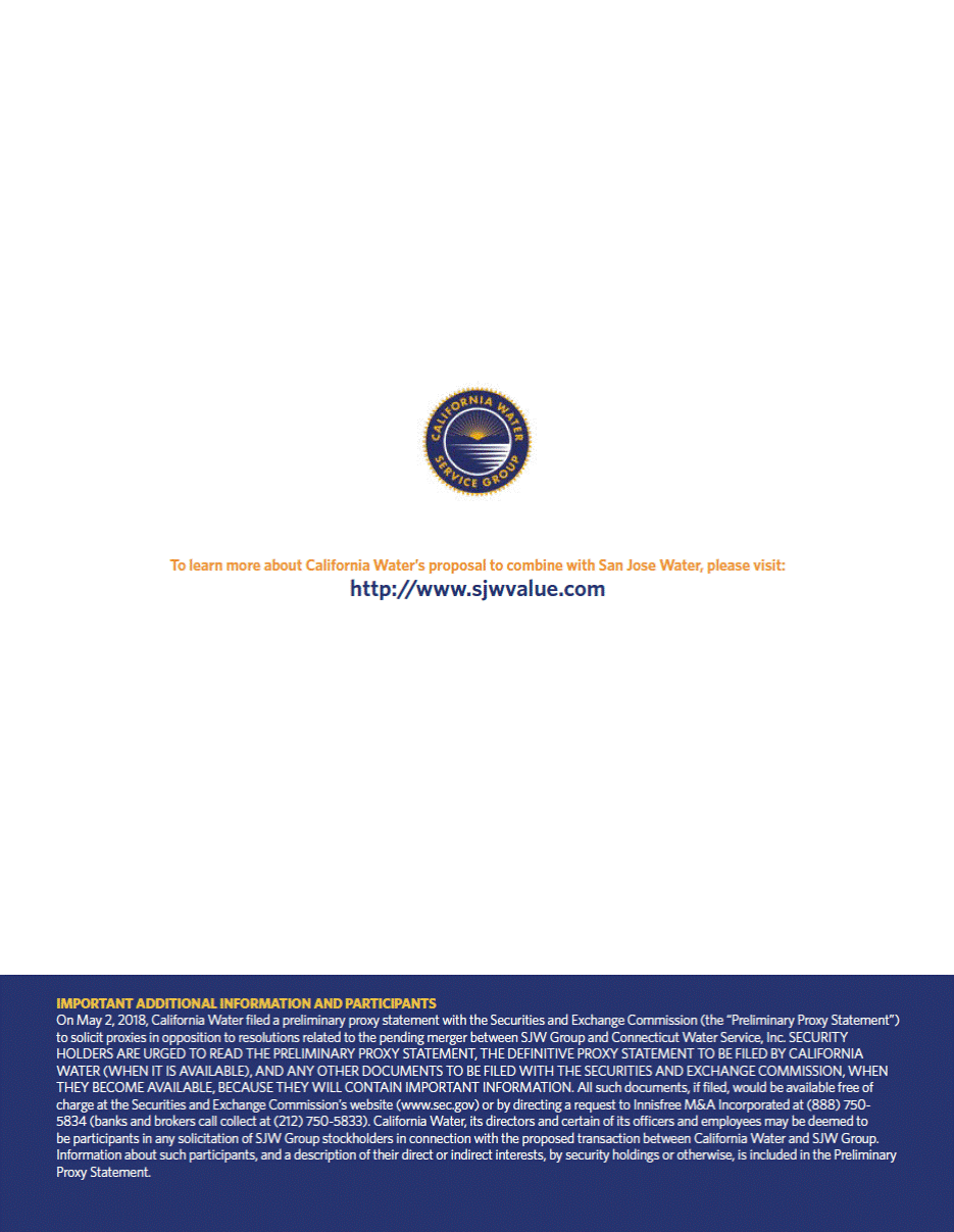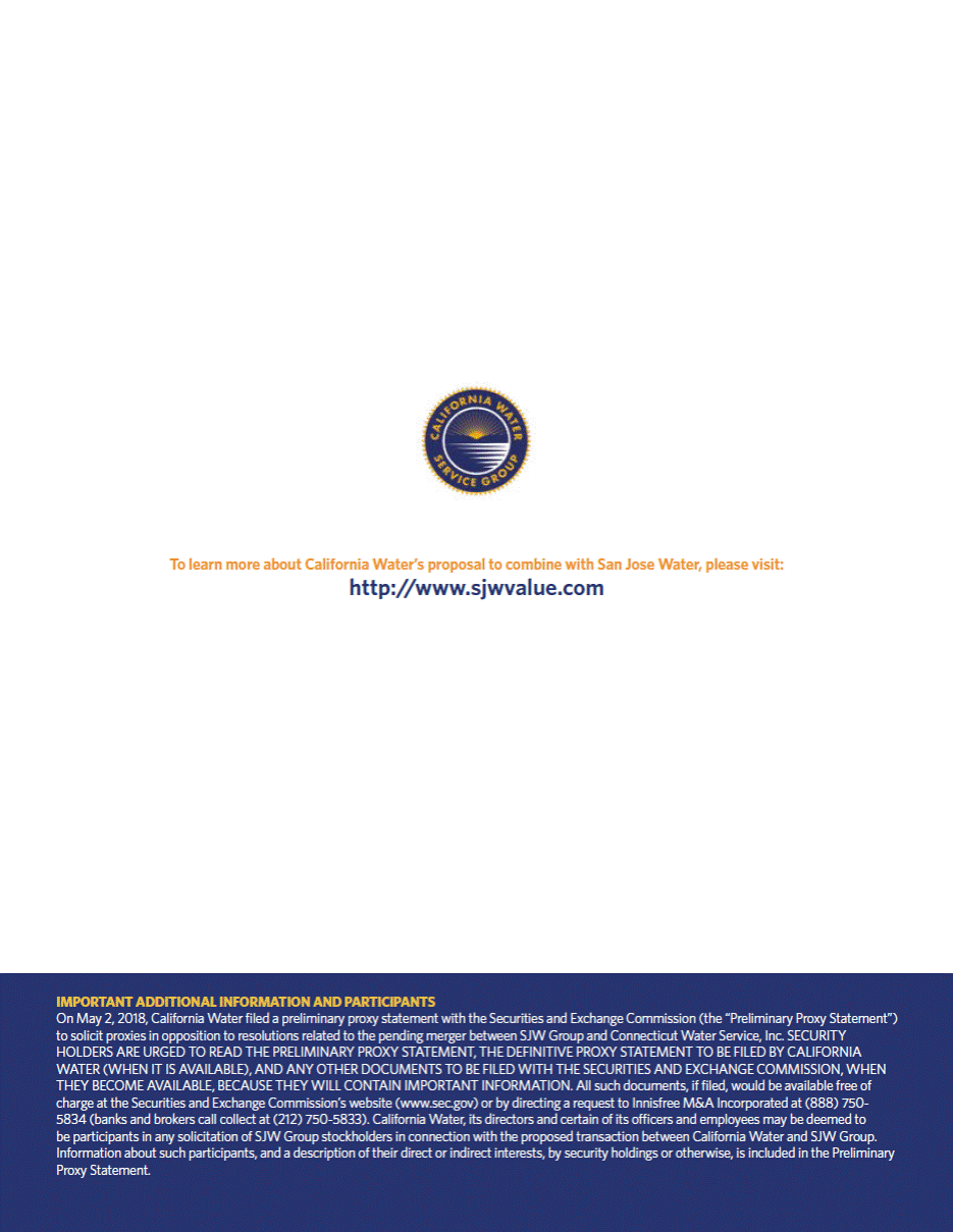 To learn more about California Waters proposal to combine with San Jose Water, please visit: http://www.sjwvalue.com IMPORTANT ADDITIONAL INFORMATION AND PARTICIPANTS On May 2, 2018, California Water filed a preliminary proxy statement with the Securities and Exchange Commission (the Preliminary Proxy Statement) to solicit proxies in opposition to resolutions related to the pending merger between SJW Group and Connecticut Water Service, Inc. SECURITY HOLDERS ARE URGED TO READ THE PRELIMINARY PROXY STATEMENT, THE DEFINITIVE PROXY STATEMENT TO BE FILED BY CALIFORNIA WATER (WHEN IT IS AVAILABLE), AND ANY OTHER DOCUMENTS TO BE FILED WITH THE SECURITIES AND EXCHANGE COMMISSION, WHEN THEY BECOME AVAILABLE, BECAUSE THEY WILL CONTAIN IMPORTANT INFORMATION. All such documents, if filed, would be available free of charge at the Securities and Exchange Commissions website (www.sec.gov) or by directing a request to Innisfree M&A Incorporated at (888) 750-5834 (banks and brokers call collect at (212) 750-5833). California Water, its directors and certain of its officers and employees may be deemed to be participants in any solicitation of SJW Group stockholders in connection with the proposed transaction between California Water and SJW Group. Information about such participants, and a description of their direct or indirect interests, by security holdings or otherwise, is included in the Preliminary Proxy Statement.