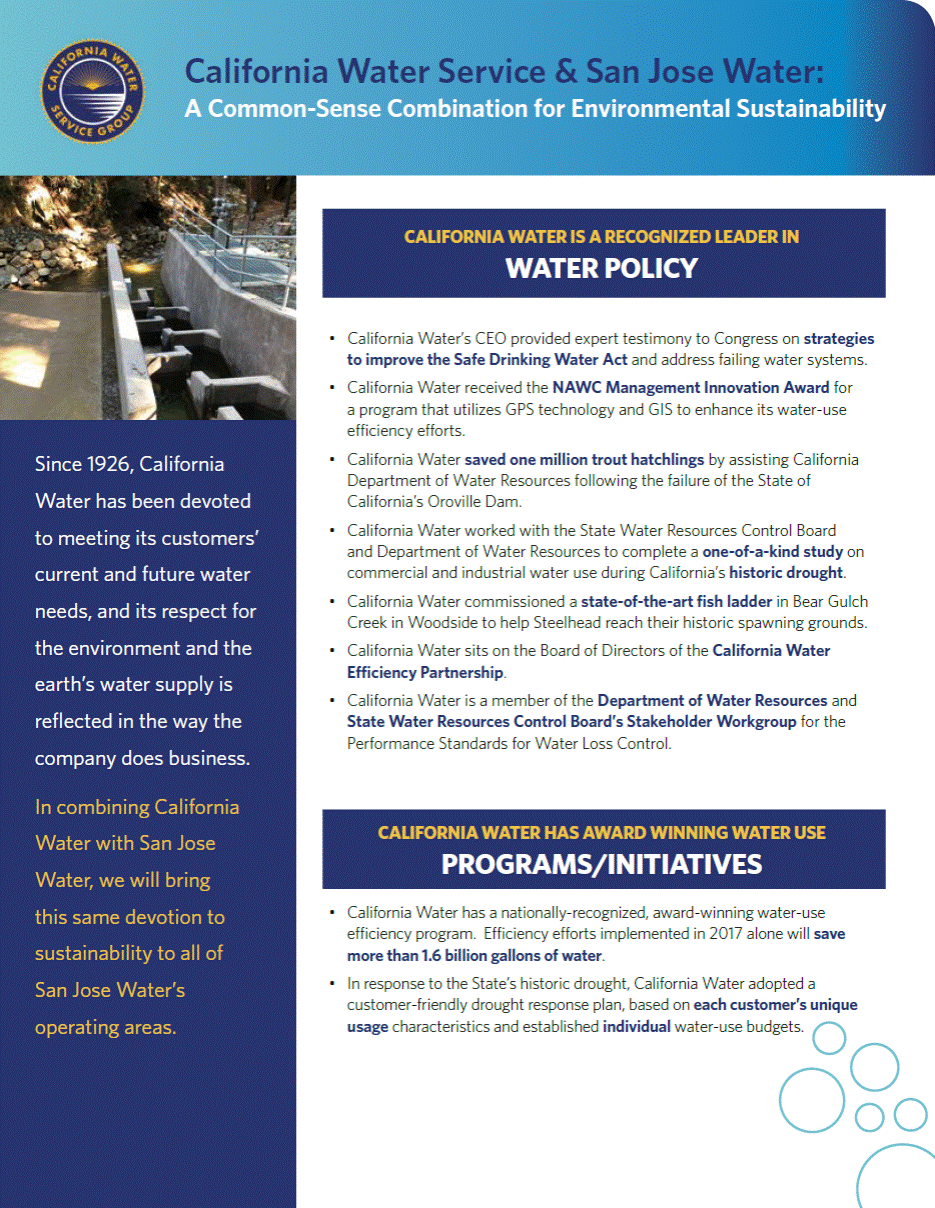 California Water Service & San Jose Water: A Common-Sense Combination for Environmental Sustainability California Waters CEO provided expert testimony to Congress on strategies to improve the Safe Drinking Water Act and address failing water systems. California Water received the NAWC Management Innovation Award for a program that utilizes GPS technology and GIS to enhance its water-use efficiency efforts. California Water saved one million trout hatchlings by assisting California Department of Water Resources following the failure of the State of Californias Oroville Dam. California Water worked with the State Water Resources Control Board and Department of Water Resources to complete a one-of-a-kind study on commercial and industrial water use during Californias historic drought. California Water commissioned a state-of-the-art fish ladder in Bear Gulch Creek in Woodside to help Steelhead reach their historic spawning grounds. California Water sits on the Board of Directors of the California Water Efficiency Partnership. California Water is a member of the Department of Water Resources and State Water Resources Control Boards Stakeholder Workgroup for the Performance Standards for Water Loss Control. Since 1926, California Water has been devoted to meeting its customers current and future water needs, and its respect for the environment and the earths water supply is reflected in the way the company does business. In combining California Water with San Jose Water, we will bring this same devotion to sustainability to all of San Jose Waters operating areas. California Water has a nationally-recognized, award-winning water-use efficiency program. Efficiency efforts implemented in 2017 alone will save more than 1.6 billion gallons of water. In response to the States historic drought, California Water adopted a customer-friendly drought response plan, based on each customers unique usage characteristics and established individual water-use budgets. CALIFORNIA WATER HAS AWARD WINNING WATER USE PROGRAMS/INITIATIVES CALIFORNIA WATER IS A RECOGNIZED LEADER IN WATER POLICY