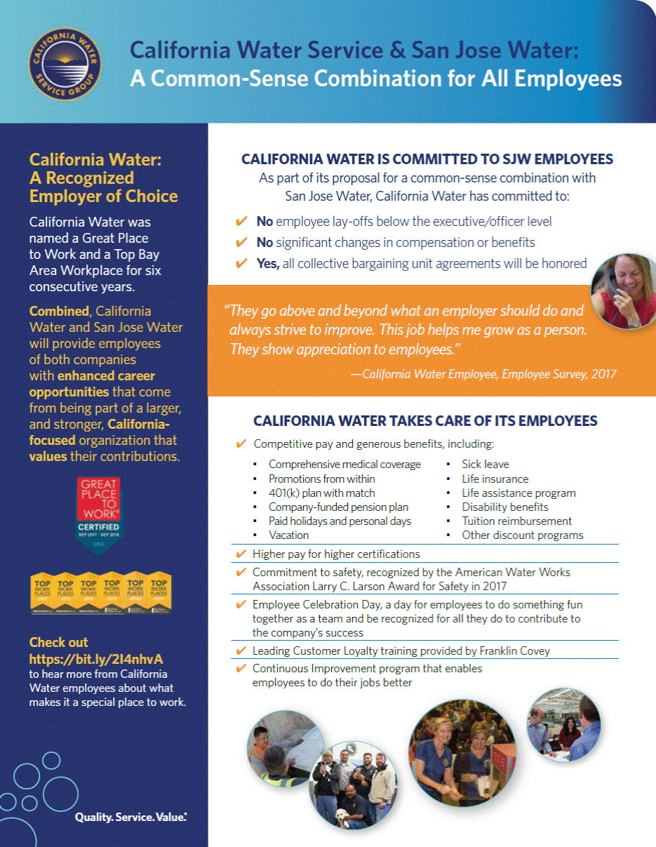 California Water Service & San Jose Water: A Common-Sense Combination for All Employees California Water: CALIFORNIA WATER IS COMMITTED TO SJW EMPLOYEES As part of its proposal for a common-sense combination with San Jose Water, California Water has committed to: A Recognized Employer of Choice California Water was named a Great Place to Work and a Top Bay Area Workplace for six consecutive years. Combined, California Water and San Jose Water will provide employees of both companies with enhanced career opportunities that come from being part of a larger, and stronger, California-focused organization that values their contributions. 4 4 4 No employee lay-offs below the executive/officer level No significant changes in compensation or benefits Yes, all collective bargaining unit agreements will be honored They go above and beyond what an employer should do and always strive to improve. This job helps me grow as a person. They show appreciation to employees. California Water Employee, Employee Survey, 2017 CALIFORNIA WATER TAKES CARE OF ITS EMPLOYEES Competitive pay and generous benefits, including: 4 Comprehensive medical coverage Promotions from within 401(k) plan with match Company-funded pension plan Paid holidays and personal days Vacation Sick leave Life insurance Life assistance program Disability benefits Tuition reimbursement Other discount programs 4 Higher pay for higher certifications 4 Commitment to safety, recognized by the American Water Works Association Larry C. Larson Award for Safety in 2017 4 Employee Celebration Day, a day for employees to do something fun together as a team and be recognized for all they do to contribute to the companys success Check out https://bit.ly/2I4nhvA to hear more from California Water employees about what makes it a special place to work. 4 Leading Customer Loyalty training provided by Franklin Covey 4 Continuous Improvement program that enables employees to do their jobs better Quality. Service.Value.®