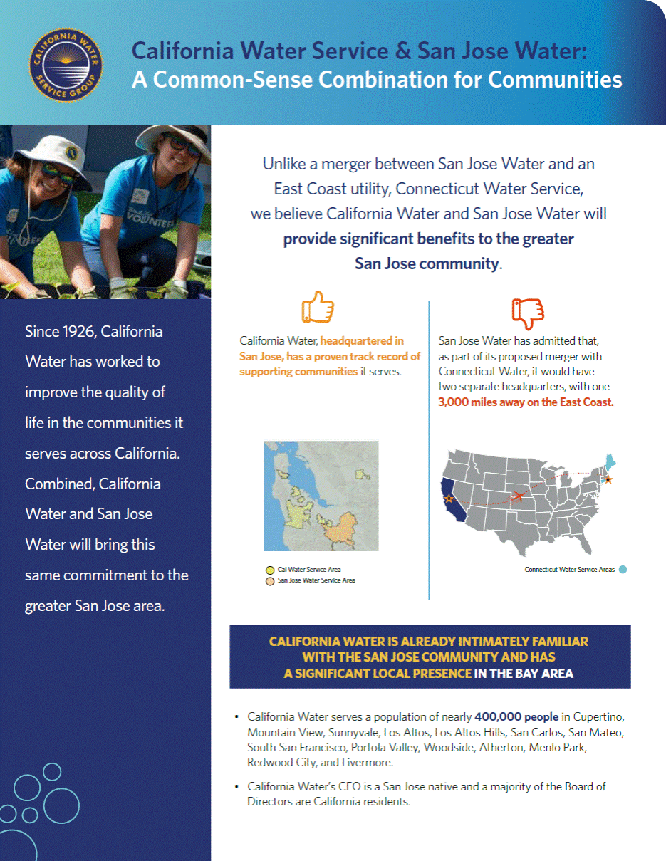 California Water Service & San Jose Water: A Common-Sense Combination A Compelling Story: Creates a Larger & Stronger California-based Water Utility 3 million people served Adjoining Service Areas in the Bay Area Allows for seamless integration and operation of combined water systems Compared to a merger between San Jose Water Group and an East Coast Utility, Connecticut Water, we believe the common-sense combination of California Water and San Jose Water will provide significant benefits to all stakeholders. Office of Ratepayer Advocates To learn more about California Waters proposal to combine with San Jose Water, please visit: http://www.sjwvalue.com 1 San Jose Water press release, 5.2.2018 2 San Jose Water investor presentation, 3.15.2018 3 San Jose Water infographic, 3.15.2018 California Water/San Jose Water: A Common-Sense Combination San Jose Water/Connecticut Water: A Merger with East Coast Utility 3,000 Miles Away CUSTOMERS 4 Elimination of redundant public company costs; savings will be shared with customers 4 San Jose Waters customers will receive California Waters award-winning customer service 4 San Jose Waters customers will benefit from operational efficiencies, additional resources, leading information technology 4 Commitment to continue strong record of infrastructure investment; California Water made $259 million of investment in water and wastewater systems in 2017 4 Review by the California Public Utilities Commission and Office of Ratepayer Advocates to ensure customers benefit There will be no change in customer rates1 Enhances customer service capabilities in New England2 San Jose Water only invested $104 million in infrastructure in 2017 No review by the California Public Utilities Commission or COMMUNITIES 4 Adjoining service areas in the Bay Area; combined 1.4 million customers served in the Bay Area 4 Creates larger California-based water utility with its headquarters remaining in San Jose 4 Board of Directors: majority California residents 4 Local roots starting at the top: California Waters CEO is a San Jose native and SJSU graduate Two separate systems located 3,000 miles apart Two headquarters with separate management teams; one in San Jose and one in New England Board of Directors: 6 of 12 would come from Connecticut Water including Chairman and Lead Director; at most only 1/3 California residents Connecticut at the top: San Jose Waters new CEO was CEO of Connecticut Water for 11 years, and has only been in San Jose since Sept. 2017 EMPLOYEES 4 No employee lay-offs below the executive level 4 Greater advancement opportunities by working for a larger, California-based water utility 4 Geographic familiarity and ability to easily share best practices will make employees more efficient Executives at both companies keep their jobs, separate interests and focuses, with no savings being shared with customers Operating two separate systems that are 3,000 miles apart provides few if any new job opportunities Difficult to share best practices from two different systems STOCKHOLDERS 4 $68.25 per-share all-cash proposal delivers immediate, certain value exceeding San Jose Waters all-time high closing price 4 Requires approval from California Public Utilities Commission, which California Water has a proven track record of working successfully with, and the Public Utility Commission of Texas 4 No financing contingency, diligence can be completed quickly 4 Synergies to be realized through elimination of redundant public company costs No premium for San Jose Water stockholders, who in our view would have to wait for uncertain benefits while bearing substantial execution risks associated with operating two separate systems 3,000 miles apart Regulatory approval needed in both Connecticut and Maine; unfamiliar territory for San Jose Water and very different regulatory regimes We believe path to completion uncertain given Eversource Energys competing bid for Connecticut Water Unidentified compelling growth and investment opportunities