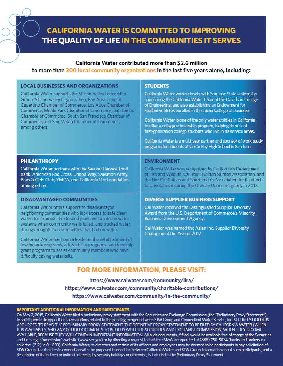California Water contributed more than $2.6 million to more than 300 local community organizations in the last five years alone, including: LOCAL BUSINESSES AND ORGANIZATIONS California Water supports the Silicon Valley Leadership Group, Silicon Valley Organization, Bay Area Council, Cupertino Chamber of Commerce, Los Altos Chamber of Commerce, Menlo Park Chamber of Commerce, San Carlos Chamber of Commerce, South San Francisco Chamber of Commerce, and San Mateo Chamber of Commerce, among others. STUDENTS California Water works closely with San Jose State University; sponsoring the California Water Chair at the Davidson College of Engineering, and also establishing an Endowment for student-athletes enrolled in the Lucas College of Business. California Water is one of the only water utilities in California to offer a college scholarship program, helping dozens of first-generation college students who live in its service areas. California Water is a multi-year partner and sponsor of work-study programs for students at Cristo Rey High School in San Jose. PHILANTHROPY California Water partners with the Second Harvest Food Bank, American Red Cross, United Way, Salvation Army, Boys & Girls Club, YMCA, and California Fire Foundation, among others. ENVIRONMENT California Water was recognized by Californias Department of Fish and Wildlife, CalTrout, Golden Salmon Association, and the Nor Cal Guides and Sportsmans Association for its efforts to save salmon during the Oroville Dam emergency in 2017. DISADVANTAGED COMMUNITIES California Water offers support to disadvantaged neighboring communities who lack access to safe clean water; for example it extended pipelines to intertie water systems when community wells failed, and trucked water during droughts to communities that had no water. DIVERSE SUPPLIER BUSINESS SUPPORT Cal Water received the Distinguished Supplier Diversity Award from the U.S. Department of Commerces Minority Business Development Agency. Cal Water was named the Asian Inc. Supplier Diversity Champion of the Year in 2017. California Water has been a leader in the establishment of low income programs, affordability programs, and hardship grant programs to assist community members who have difficulty paying water bills. FOR MORE INFORMATION, PLEASE VISIT: https://www.calwater.com/community/lira/ https://www.calwater.com/community/charitable-contributions/ https://www.calwater.com/community/in-the-community/ IMPORTANT ADDITIONAL INFORMATION AND PARTICIPANTS On May 2, 2018, California Water filed a preliminary proxy statement with the Securities and Exchange Commission (the Preliminary Proxy Statement) to solicit proxies in opposition to resolutions related to the pending merger between SJW Group and Connecticut Water Service, Inc. SECURITY HOLDERS ARE URGED TO READ THE PRELIMINARY PROXY STATEMENT, THE DEFINITIVE PROXY STATEMENT TO BE FILED BY CALIFORNIA WATER (WHEN IT IS AVAILABLE), AND ANY OTHER DOCUMENTS TO BE FILED WITH THE SECURITIES AND EXCHANGE COMMISSION, WHEN THEY BECOME AVAILABLE, BECAUSE THEY WILL CONTAIN IMPORTANT INFORMATION. All such documents, if filed, would be available free of charge at the Securities and Exchange Commissions website (www.sec.gov) or by directing a request to Innisfree M&A Incorporated at (888) 750-5834 (banks and brokers call collect at (212) 750-5833). California Water, its directors and certain of its officers and employees may be deemed to be participants in any solicitation of SJW Group stockholders in connection with the proposed transaction between California Water and SJW Group. Information about such participants, and a description of their direct or indirect interests, by security holdings or otherwise, is included in the Preliminary Proxy Statement. CALIFORNIA WATER IS COMMITTED TO IMPROVING THE QUALITY OF LIFE IN THE COMMUNITIES IT SERVES
